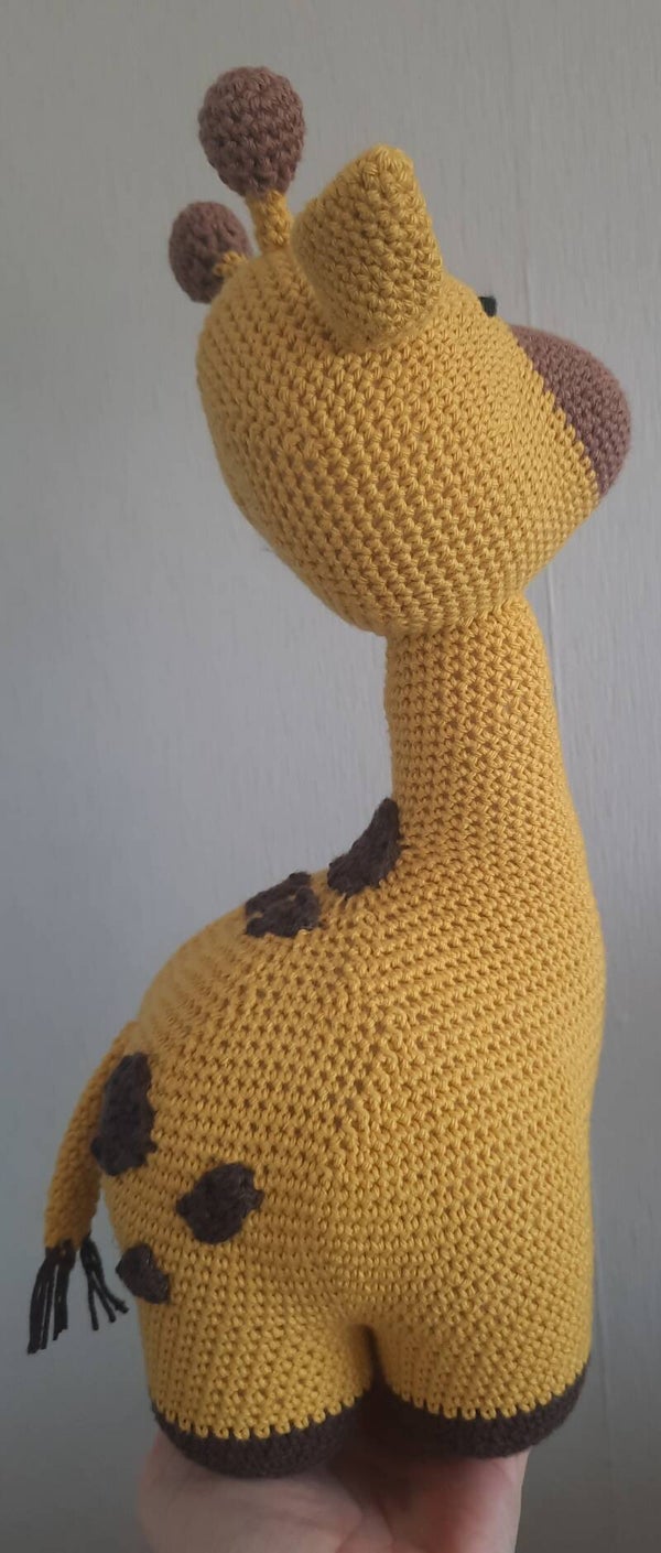 Superleuke gehaakte giraffeknuffel. Gemaakt van 100% katoen, gevuld met polyester panda-vulling. De knuffel kan gewassen worden op max 40 graden.